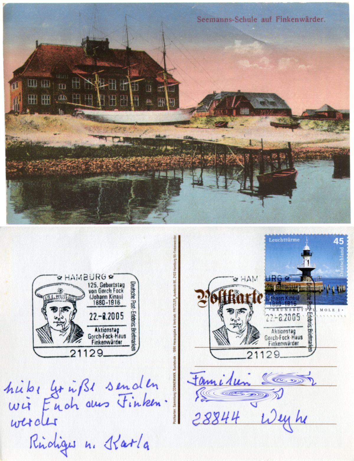Hier eine nette Reproduktion, welche am 22.08.2005 taggenau für den Grußversand zum 125. Geburtstag von Gorch Fock im Rahmen eines Aktionstages aus dem „Gorch-Fock-Haus“ auf „Finkenwärder“ verwendet wurde. Fock wurde am 22.08.1880 geboren und starb am 31.05.1916 in der Seeschlacht am Skagerrak. Auf einer späteren Ansichtskarte mit einem s/w Foto des Schiffes in einer etwas anderen Perspektive ist vermerkt: