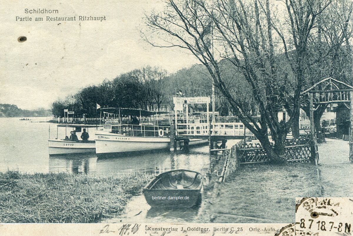 AK postalisch gelaufen 01.08.1916„Waldow 5“ (oder 8, aber ich glaube doch 5) mit „Lotte“, postalisch gelaufen 07.07.1918. Die beiden Fotos scheinen nacheinander aufgenommen, siehe ganz hinten links das Boot, der Schwan scheint zur Motivverschönerung später hinzugefügt: