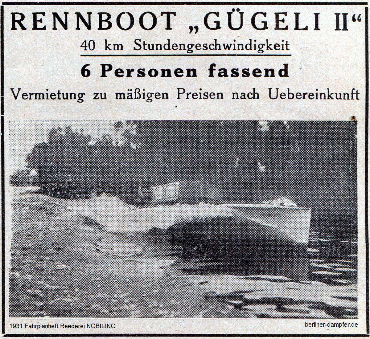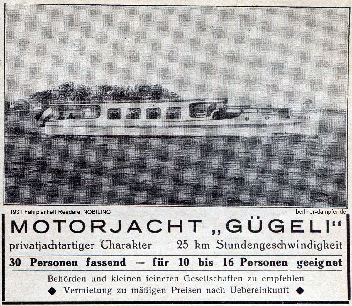 Alle sechs Schiffe der Reederei Nobiling standen trotz verbesserter Einrichtung zu normalen Fahrpreisen dem Berliner Durchschnittsbürger und Schulklassen zur Verfügung. „Behörden und kleinen feineren Gesellschaften“ empfahl die Reederei allerdings ihre bis zu 30 Personen fassende Motoryacht „Gügeli“, die ebenso wie das kleinere, für 6 Personen vermessene Rennboot „Gügeli II“ ihren eigenartigen Namen nach den Vornamen der Kinder Heinrich Nobilings, nther, Gerda, Lieselotte hatte.