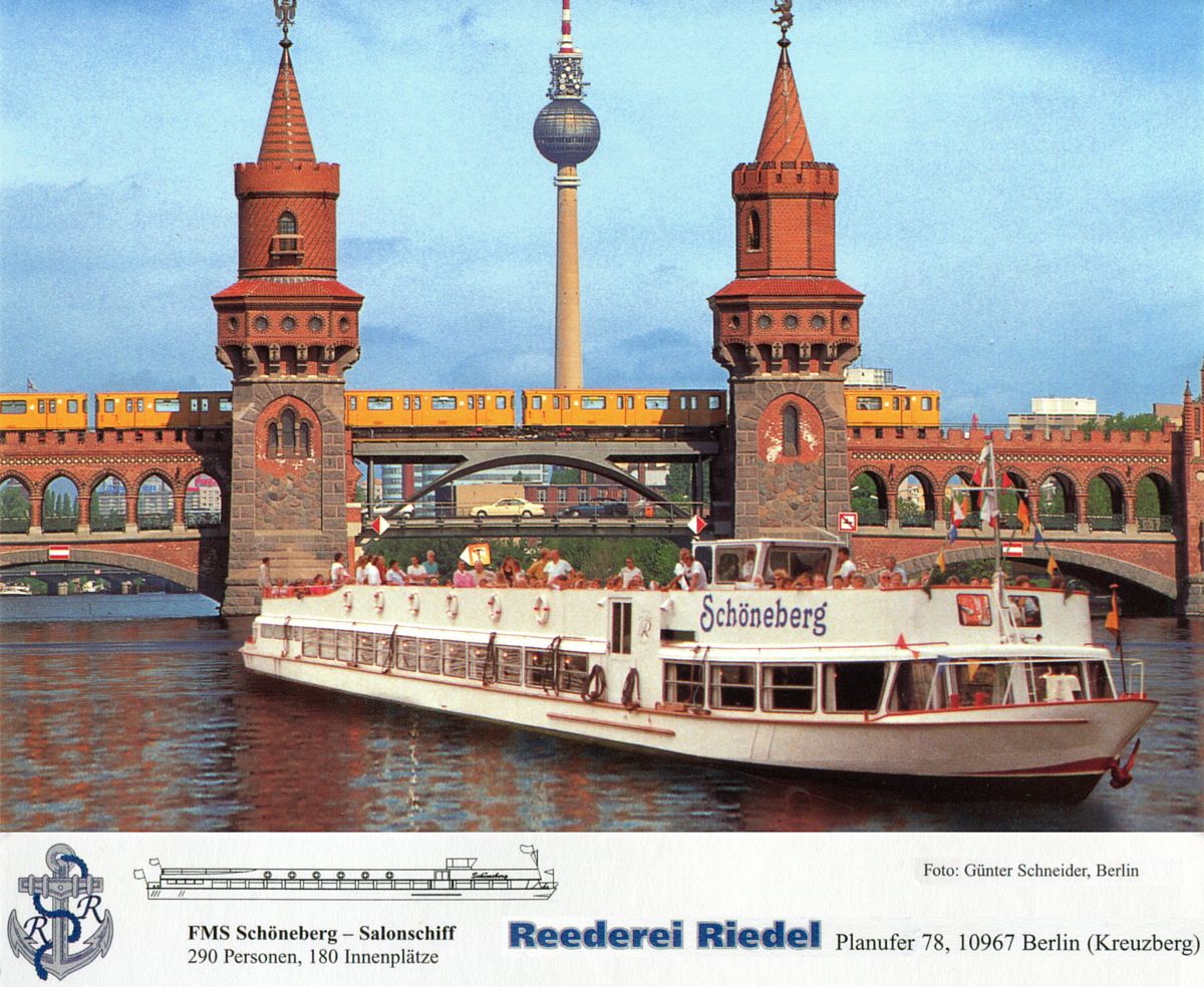 | „Schöneberg“ 1995 ca. an der Oberbaumbrücke. Werbekarte der Reederei Riedel, Fotograf Günter Schneider. Ich bin mir nicht sicher, ob es sich um eine reale Aufnahme handelt, oder ob das Schiff in das Motiv eingefügt wurde? Beachte hier noch die alten Fenster und den alten Namensschriftzug.