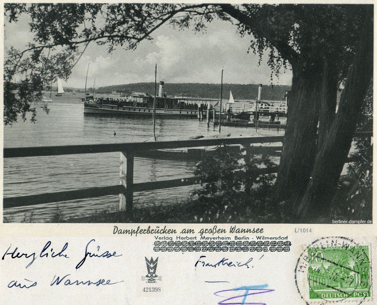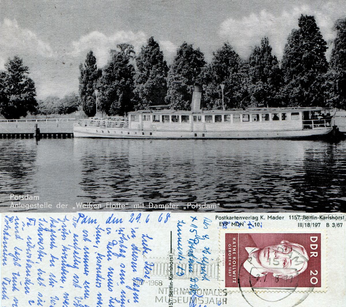 AK, Aufnahmejahr vermutlich 1967, postalisch gelaufen 29.06.1968 von Potsdam nach Quickborn in Schleswig-Holstein. Frankiert mit DDR Michelnummer 1295 aus 1967, 20 Pfennig, Berühmte Persönlichkeiten, Käthe Kollwitz. In der Karte geht es nicht um eine „Dampferfahrt“, sondern um verwandschaftliche Geburtstagsgrüße und die jeweiligen Kinder, also um das familiäre Kontakthalten. |
