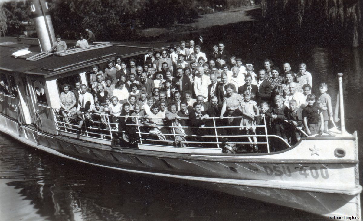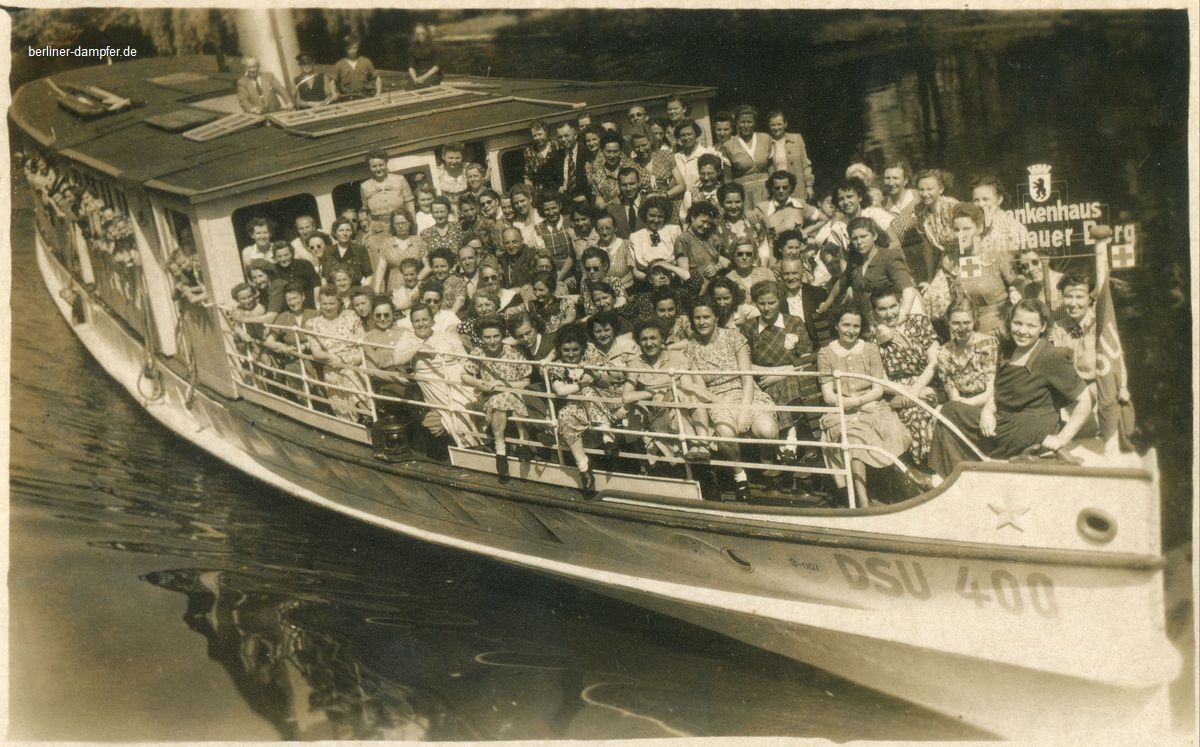 Andenkenfoto. Aufnahmejahr unbekannt, geschätzt 1956. Schiffskennung „3-007“ und „DSU400“. Brigadeausflug (?) Krankenhaus Prenzlauer Berg, „Krankenschwestern“, da fast alles Damen. ![]() |