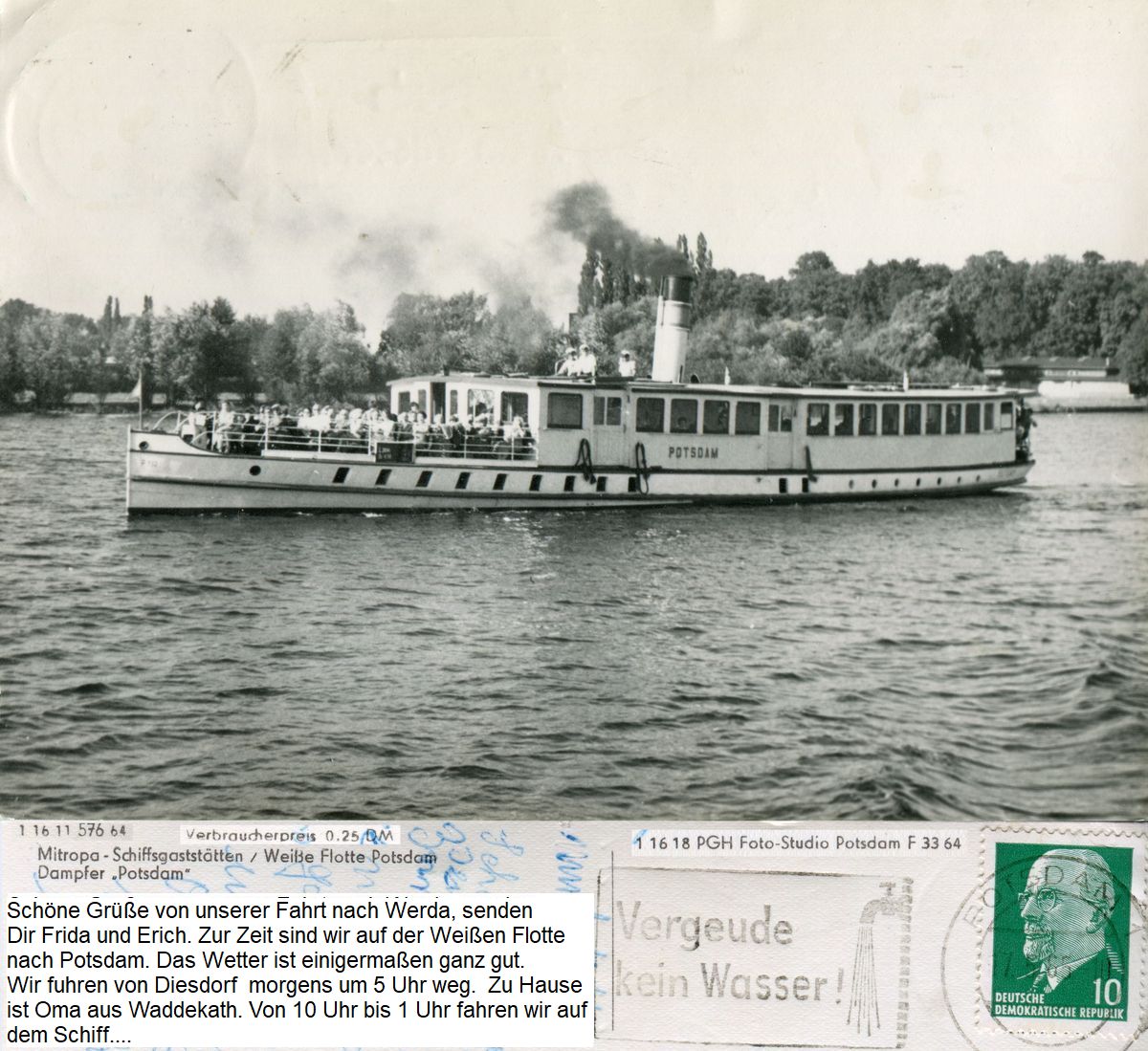 Hier auch ein sehr netter Text, aus welchem sich für diese „Dampferfahrt“ eine sehr lange Anreise ergibt, scheinbar handelte es sich um einen langen Tagesausflug, von Diesdorf in Sachsen-Anhalt nach Potsdam, dann nach Werda im Vogtland und dann wieder nach Diesdorf. Wau! Aber vielleicht ist versehendlich auch nicht Werda, sondern Werder (Havel) gemeint.