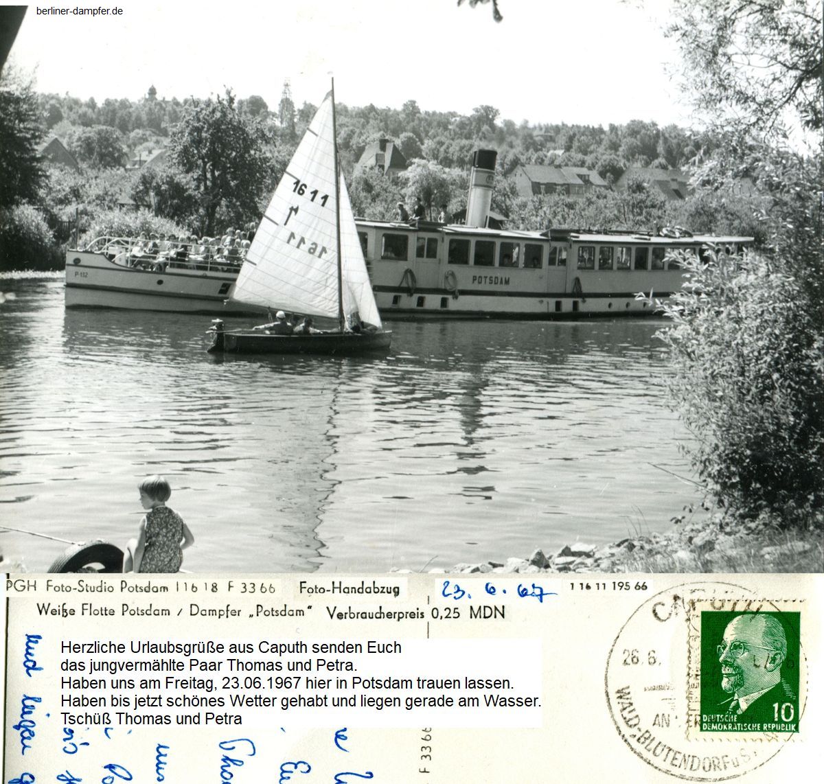 AK, Aufnahmejahr vermutlich 1966, postaltisch gelaufen 26.06.1967 von Caputh nach „Karl-Marx-Stadt“. Frankiert mit DDR Michelnummer 846 aus 1961, 10 Pfennig, Dauermarkenserie: Staatsratsvorsitzender Walter Ulbricht. Die „Potsdam“ trägt hier die Schiffskennung „P-132“. Diese AK hat eine sehr netten Inhalt: