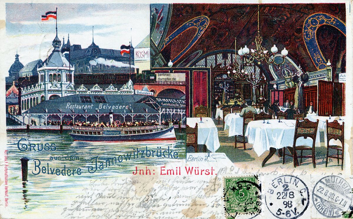 „Dorothea“ an der „Dampferstation Gesellschaft Stern“ an der Jannowitzbrücke. AK postalisch gelaufen 22.08.1898, fankiert mit DR Michelnummer 46. ![]() ![]() |