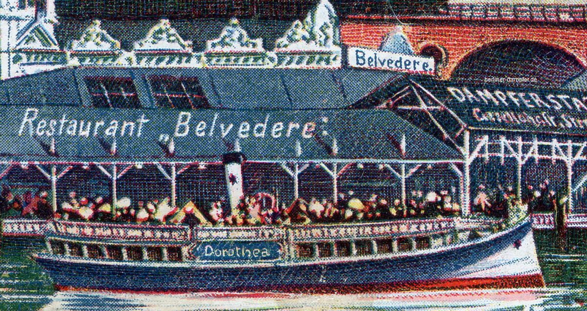 Dampfer „Dorothea“ als schmückendes Beiwerk zum Panorama von Stralau mit Spreelauf und zum Spreetunnel Stralau–Treptow. Der Tunnel galt damals als Attraktion. Am 18. Dezember 1899 nahmen die Berliner Ostbahnen den Liniendienst durch den Tunnel als erste öffentliche Untergrundbahn Deutschlands zwischen dem Schlesischen Bahnhof (heute: Ostbahnhof) und Treptow auf.