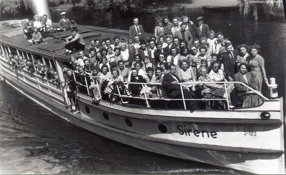 Um 1912 befand sich im Kurfürstendamm Nummer 12 (“an der Kaiser-Wilhelm-Gedächtnis-Kirche) das “Englische Café” („Künstler-Concert / Spiel- und Billard-Säle“). Die Aufnahme ist am 22. Juni enstanden, möglicherweise in der Zeit um 1936, da sich auf dem Bug der “Sirene” ein für diese Zeit auf fast allen Fahrgastschiffen üblicher Hakenkreuzwimpel befindet.