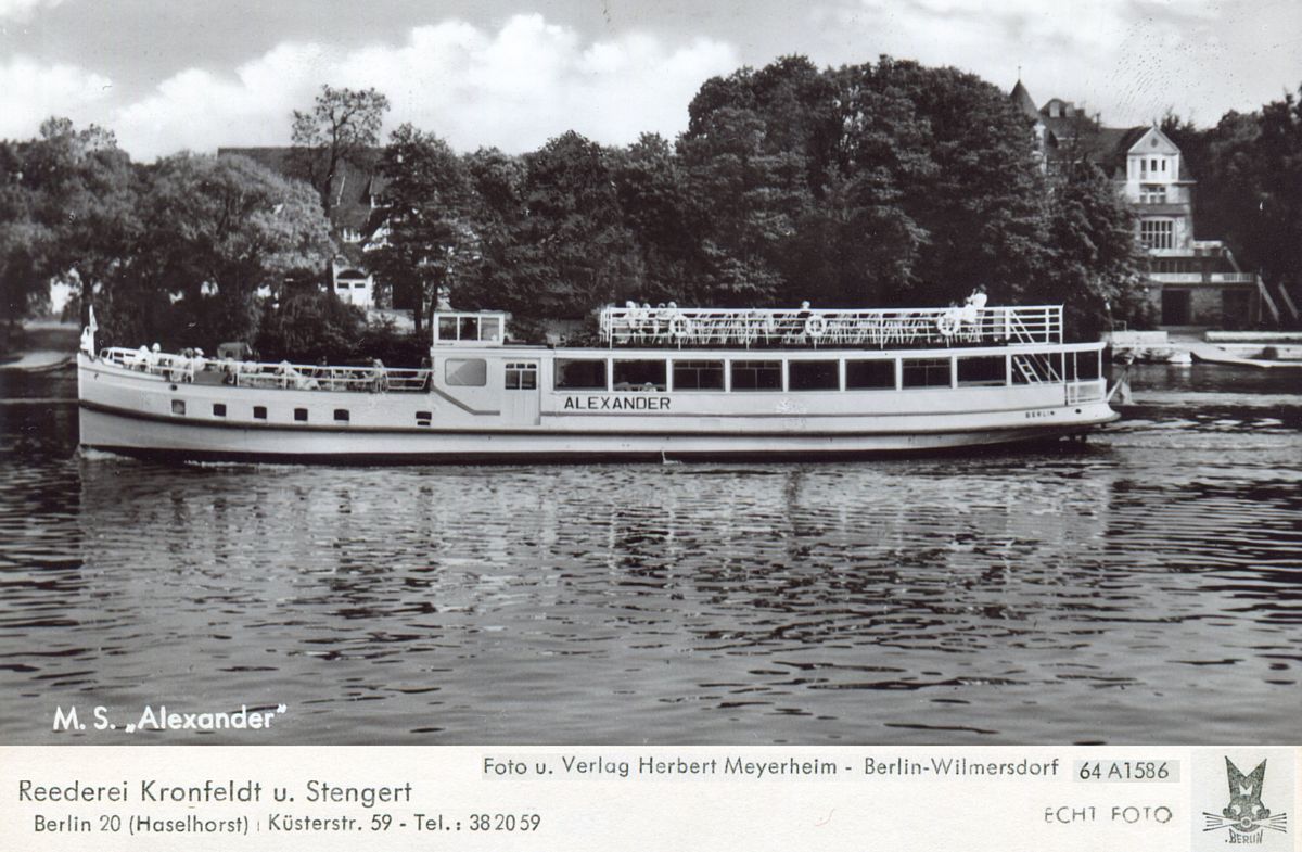 Groggert 1988, Seite 148 Groggert 1988, Seite 170 Groggert weist auf Seite 210 für das Jahr 1935 noch immer die Reederei (Ernst) Kieck als Eigner des “Alexander” aus. Auf den Seiten 272 und 292 ebenso auch für die Jahre 1953 und 1958. Groggert weist auf den Seiten 250, 252, 258 und 260 aus, dass der “Alexander” nach Ende des Zweiten Weltkrieges für die BVG Personenschifffahrt eingesetzt wurde (1944-1949). Als Eigner wird weiterhin die Reederei Kieck angegeben. Grogggert 1988, Seite 294: Groggert weist auf Seite 298 für das Jahr 1968 die Reederei W. Kronfeld, Inhaber R. Stengert als Eigner aus. Auf Seite 309 wird für das Jahr 1987 als Eigner die Reederei Rudolf Stengert angegeben. |