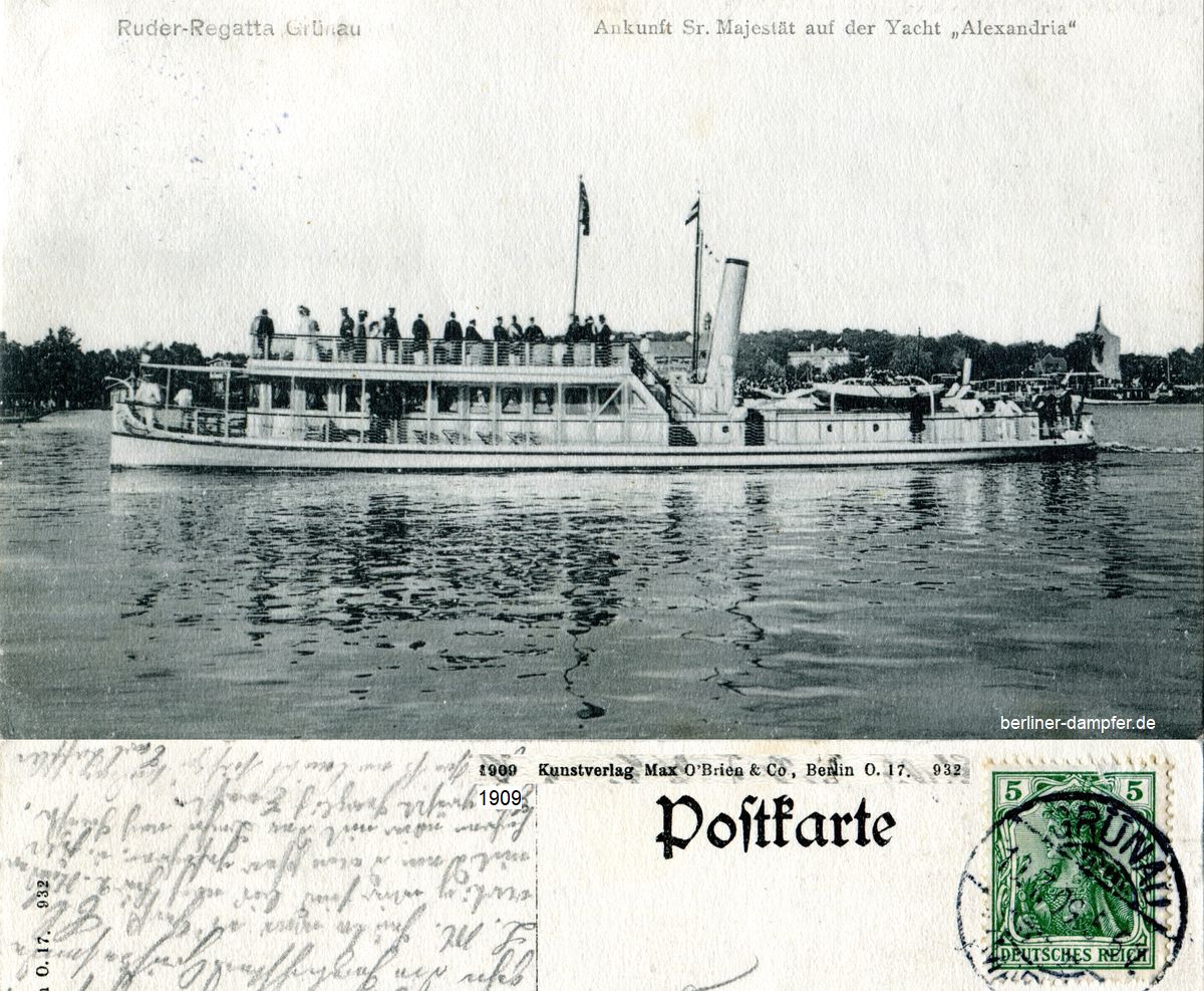 Groggert 1988, Seite 110: Auch das Oberhofmarschallamt folgte der in Berlin und seiner Umgebung eingetretenen Entwicklung und verkaufte die noch von der Preußischen Seehandlung übernommene “Alexandria” 1887 an die Firma Benz in Havelberg, die den Seitenraddampfer bei Aron & Gollnow in Stettin zum Schlepper umbauen ließ. Im gleichen Jahr lieferten die Stettiner Oderwerke als neue “Dampfyacht der Allerhöchsten Herrschaften” einen 29,4 m langen, 5,1 m breiten Doppelschraubendampfer ab, der ebenfalls den Namen “Alexandria” erhielt und bei der Matrosenstation in Potsdam stationiert wurde. Dieses Schiff, mit dem der kranke Kaiser Friedrich III. am 1.6.1888 vom Schloß Charlottenburg nach Potsdam gebracht worden ist, wo er kurz darauf verstarb, diente seinem Nachfolger Wilhelm II. bei vielen offiziellen Anlässen [z. B. Eröffnung des Teltowkanals und Ruder-Regatta-Eröffnung in Berlin- Grünau] als Staatsyacht. 1921 erwarb eine jugoslawische Reederei die “Alexandria”, die sie als Schlepper auf der Donau seinsetzte. Erst 1985 ist das Schiff, das zuletzt “Rudnik” hieß, verschrottet worden. |