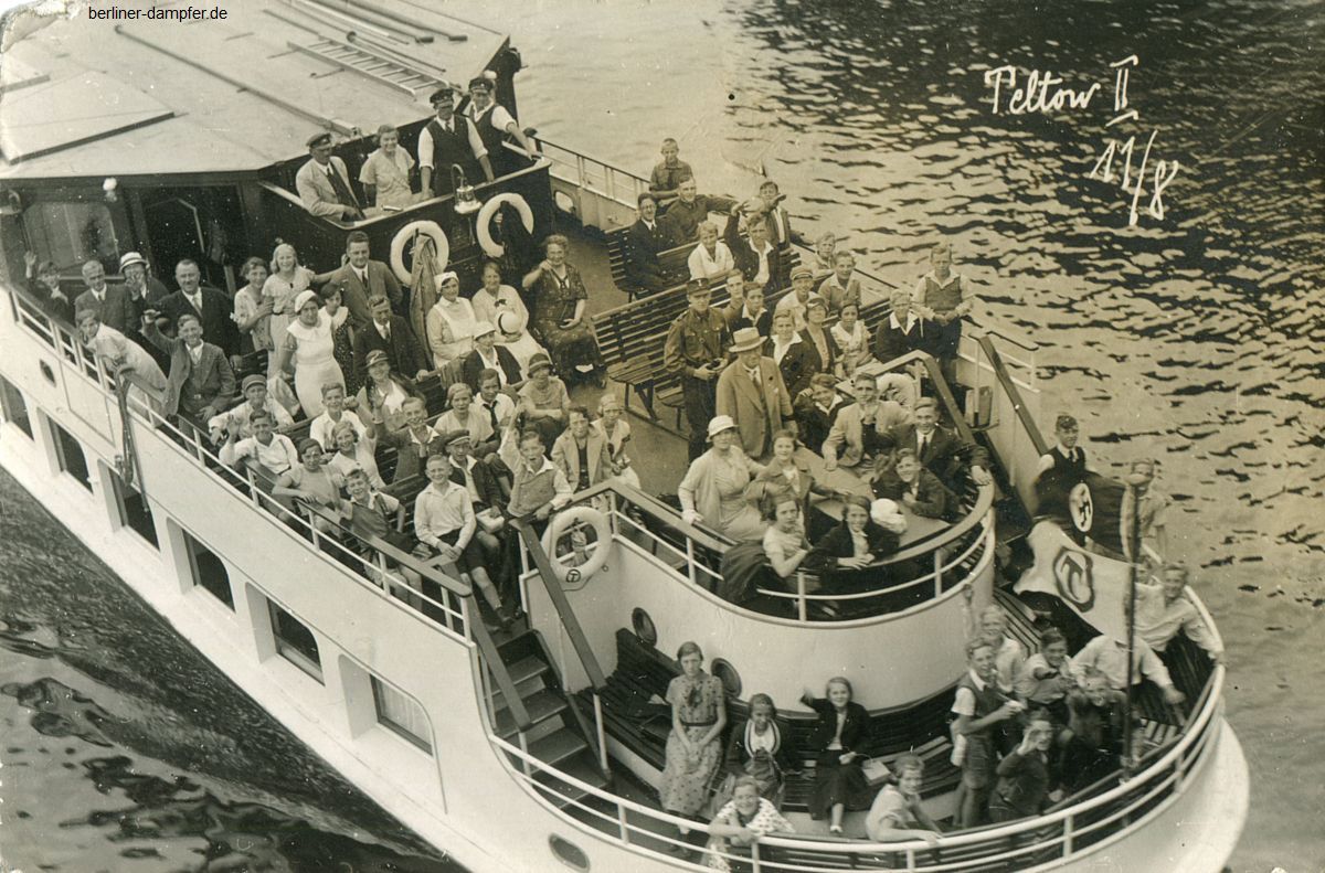 Trost, 1988, Seite 38: 1913 lieferten sie die Schwesterschiffe NEUKÖLLN und TEMPELHOF unter Bau-Nr. 710 und 711, je 30,00 m lang und 5,40 m breit, die einen Leertiefgang von nur 65 cm hatten. Als Antrieb kamen je 2 Benzinmotoren mit einer Leistung von von 2x50PSe zum Einbau. NEUKÖLLN war für 543 Personen, TEMPELHOF für 597 vermessen.; 1935 wurden die Otto-Motoren gegen Diesel-Motoren mit 2x75PSe Leistung ausgetauscht, NEUKÖLLN hieß von da ab LICHTERFELDE. 1914 folgten die Schwesterschiffe WILMERSDORF und TELTOW unter Bau-Nr. 727 und 728; als einzigen Unterschied besaßen diese Schiffe 3 Otto-Motoren je 40 PSe Leistung, die ebenfalls 1935 gegen 2 Diesel-Motoren mit 2x75PSe ausgewechselt wurden. WILMERSDORF faßte 543, TELTOW 597 Personen. Bis auf WILMERSDORF, das bei Kriegsende im Humboldthafen lag, mußten alle Schiffe an die UDSSR abgeliefert werden. Trost, 1988, Seite 43: Im Schleppeinsatz oder als beschlagnahmte Schiffe durch die Wehrmacht gingen WANNSEE, STEGLITZ, ALT-GLINICKE, ADLERSHOF und die Motorschiffe METEOR und WILMERSDORF verloren. |