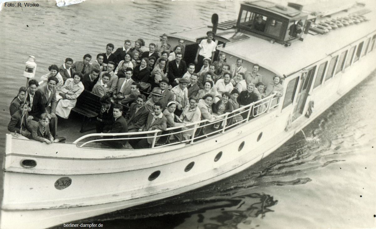 Fotokarte, Aufnahmejahr unbekannt. „Pankgraf“ Schiffskennung „3-328“. Im Gegensatz zur nächsten Fotokarte sieht die Schiffskennzahl hier noch etwas „Frei-Hand“ aufgemalt aus. Vielleicht zeigt das Bild einen Betriebsausflug? Der „Herr am Bug mit Hut“ könnte dann Herr Albert Selpin sein? Es gab auch eine Redderei Albert Selpin in Marienwerder (Bez. Potsdam), Diese betrieb die Dampfer „Fritz I, II, III, IV“. Ob hier Personengleichheit besteht, ist mir nicht bekannt. |